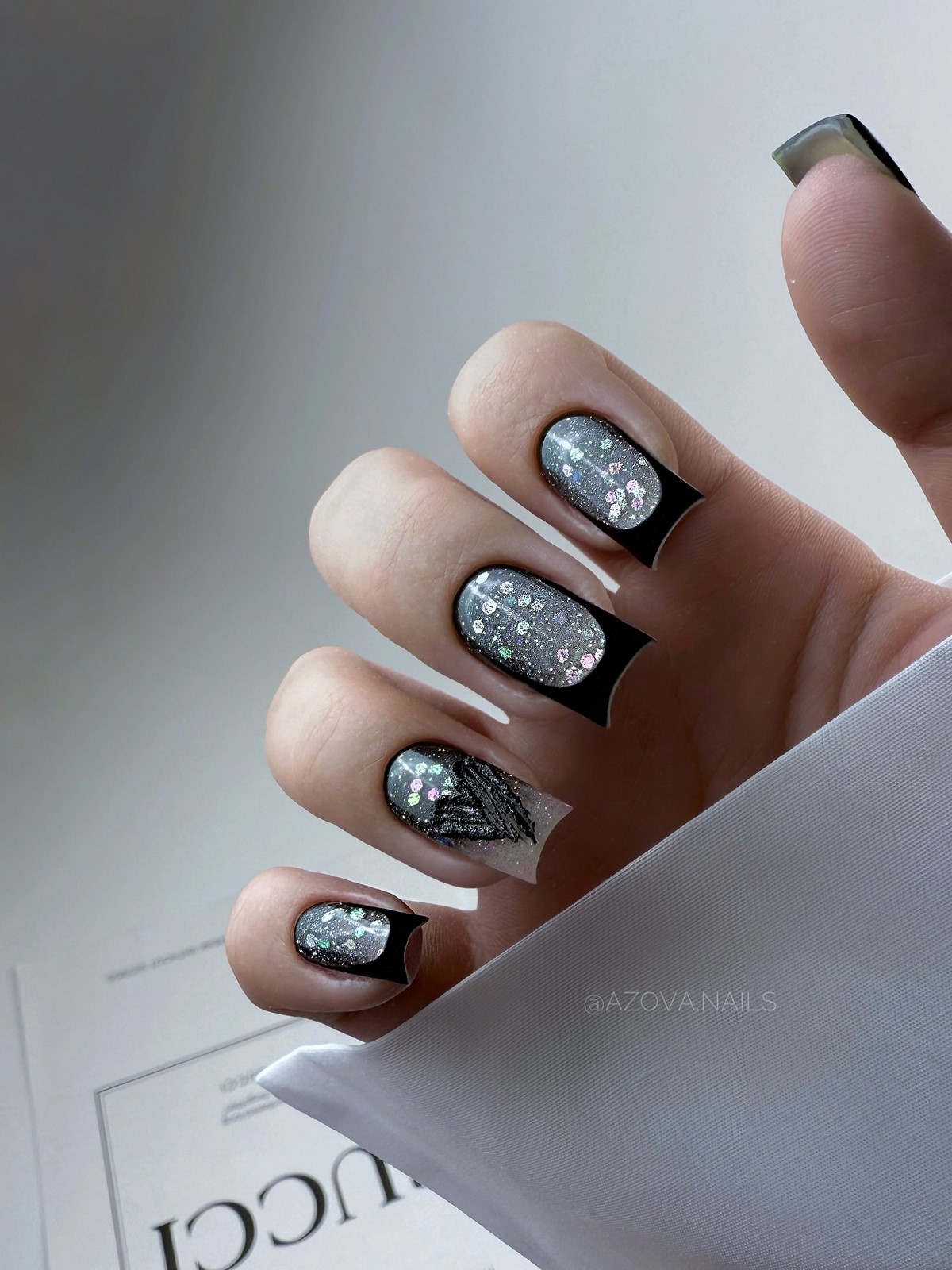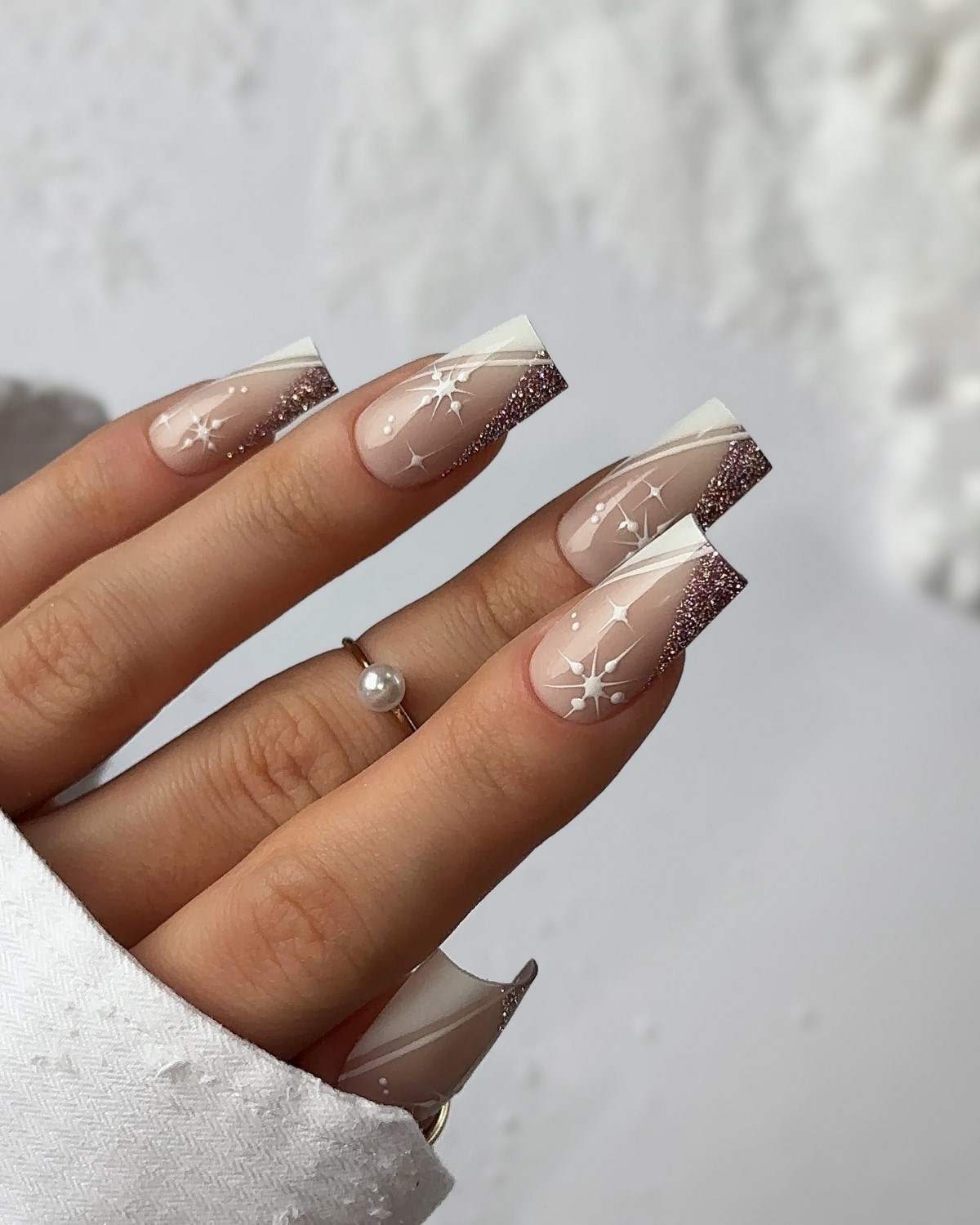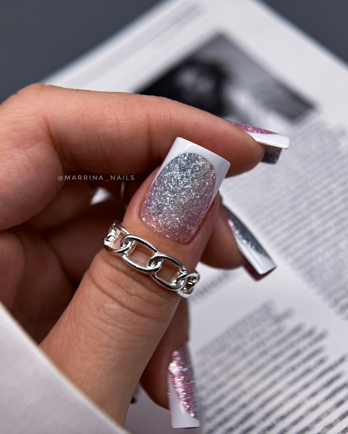 Блеск снега, мерцание гирлянд, сияние праздников — всё это вдохновило мастеров на создание сверкающего френча. Глиттер наносится на кончики или растягивается градиентом к середине ногтя. Особенно эффектно выглядит серебристо-белый или розово-золотой глиттер.