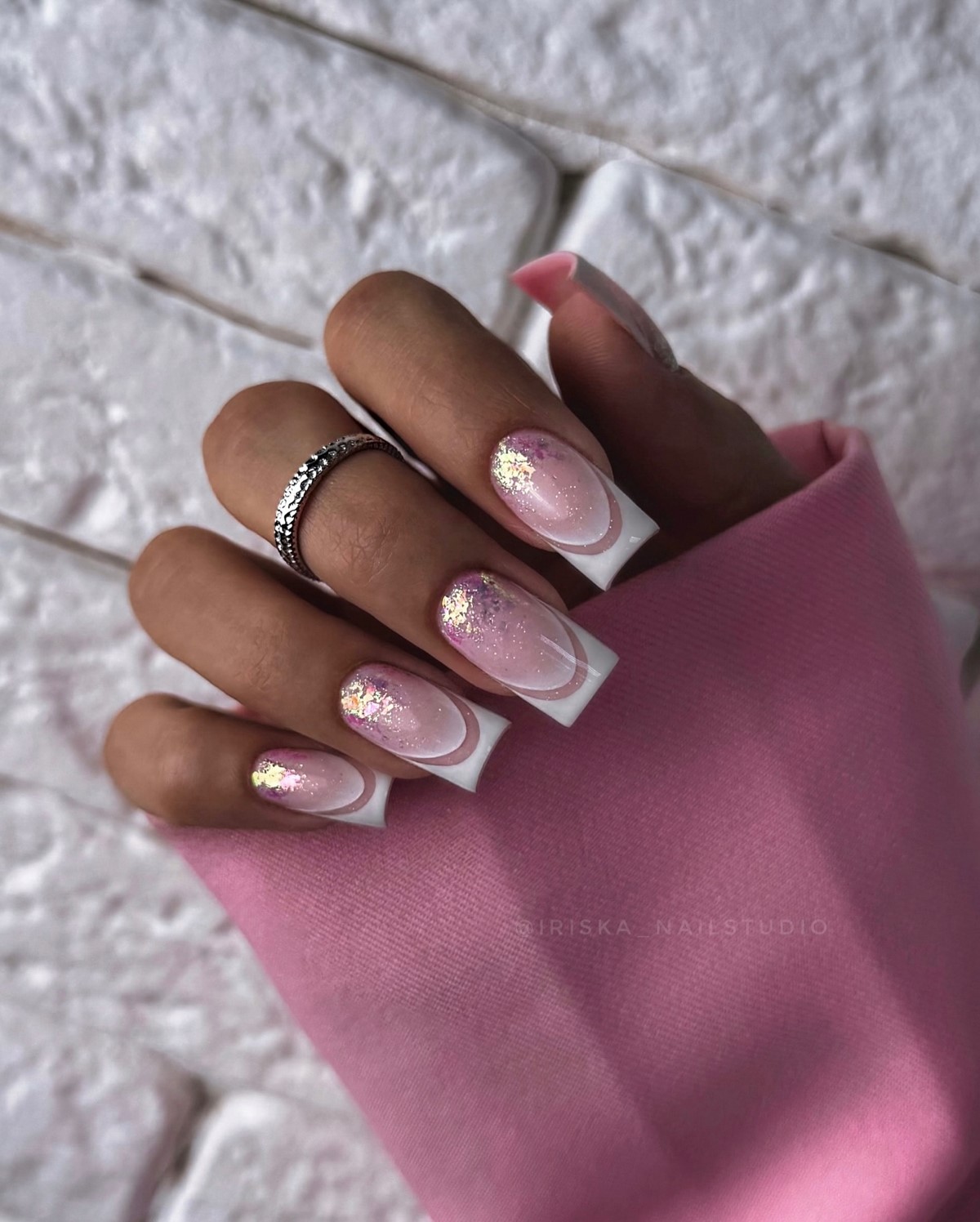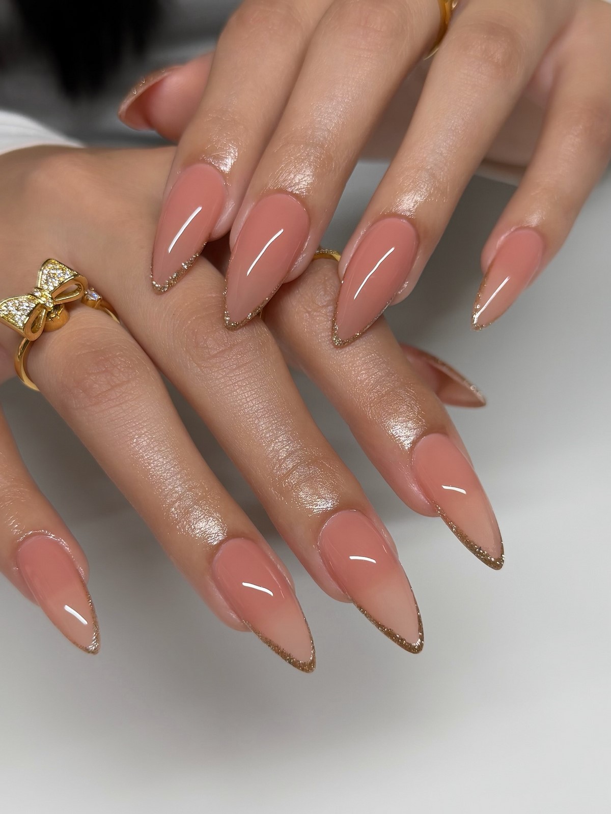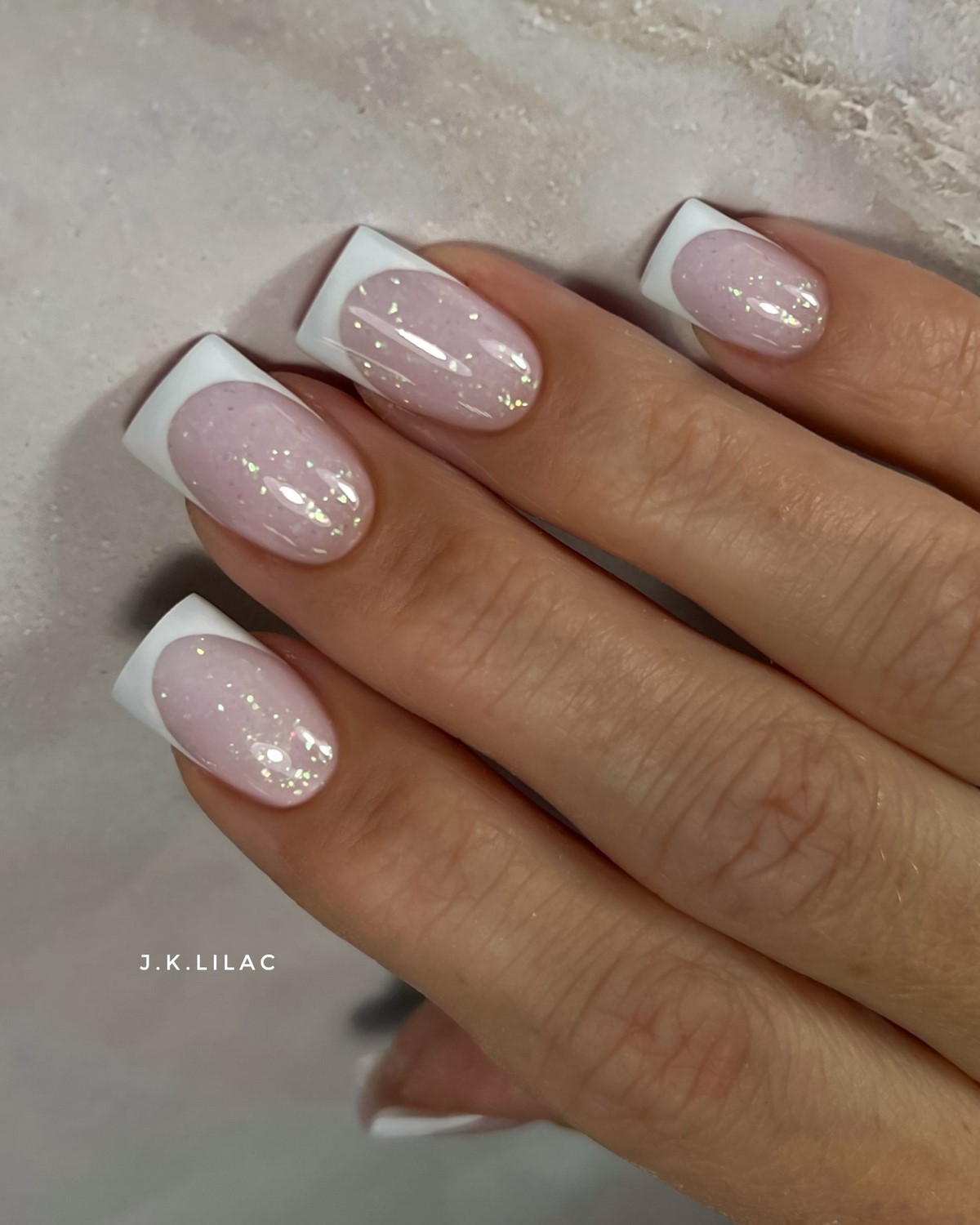 Блеск снега, мерцание гирлянд, сияние праздников — всё это вдохновило мастеров на создание сверкающего френча. Глиттер наносится на кончики или растягивается градиентом к середине ногтя. Особенно эффектно выглядит серебристо-белый или розово-золотой глиттер.