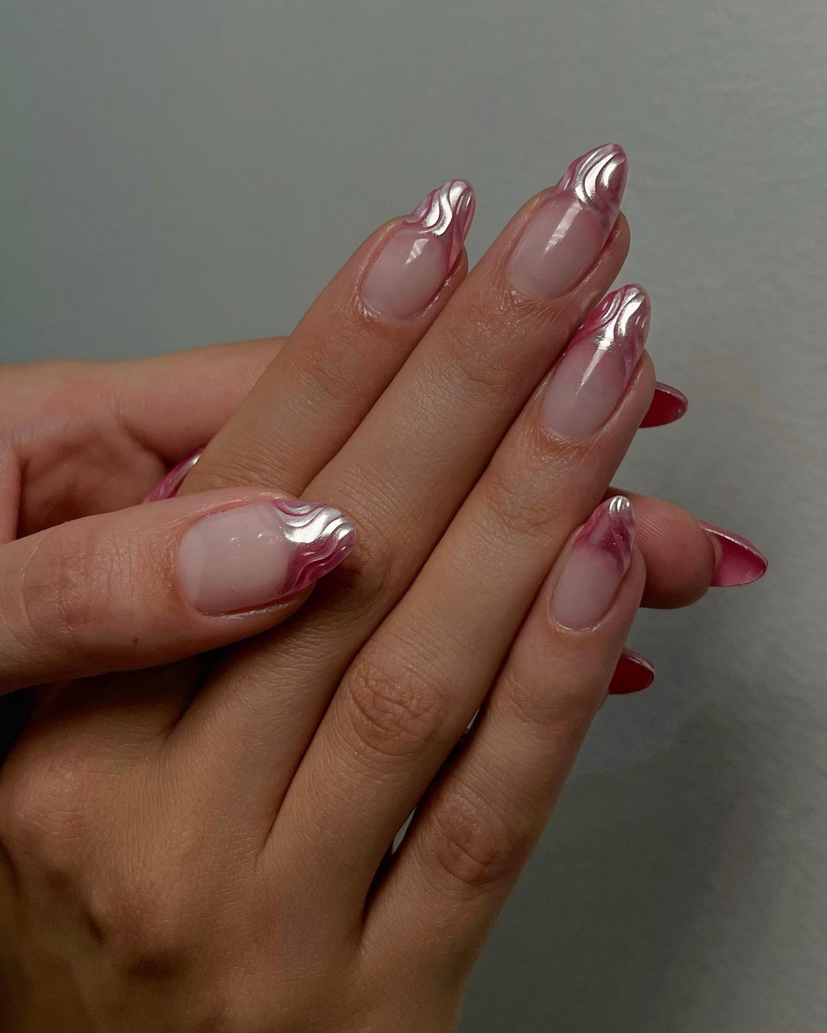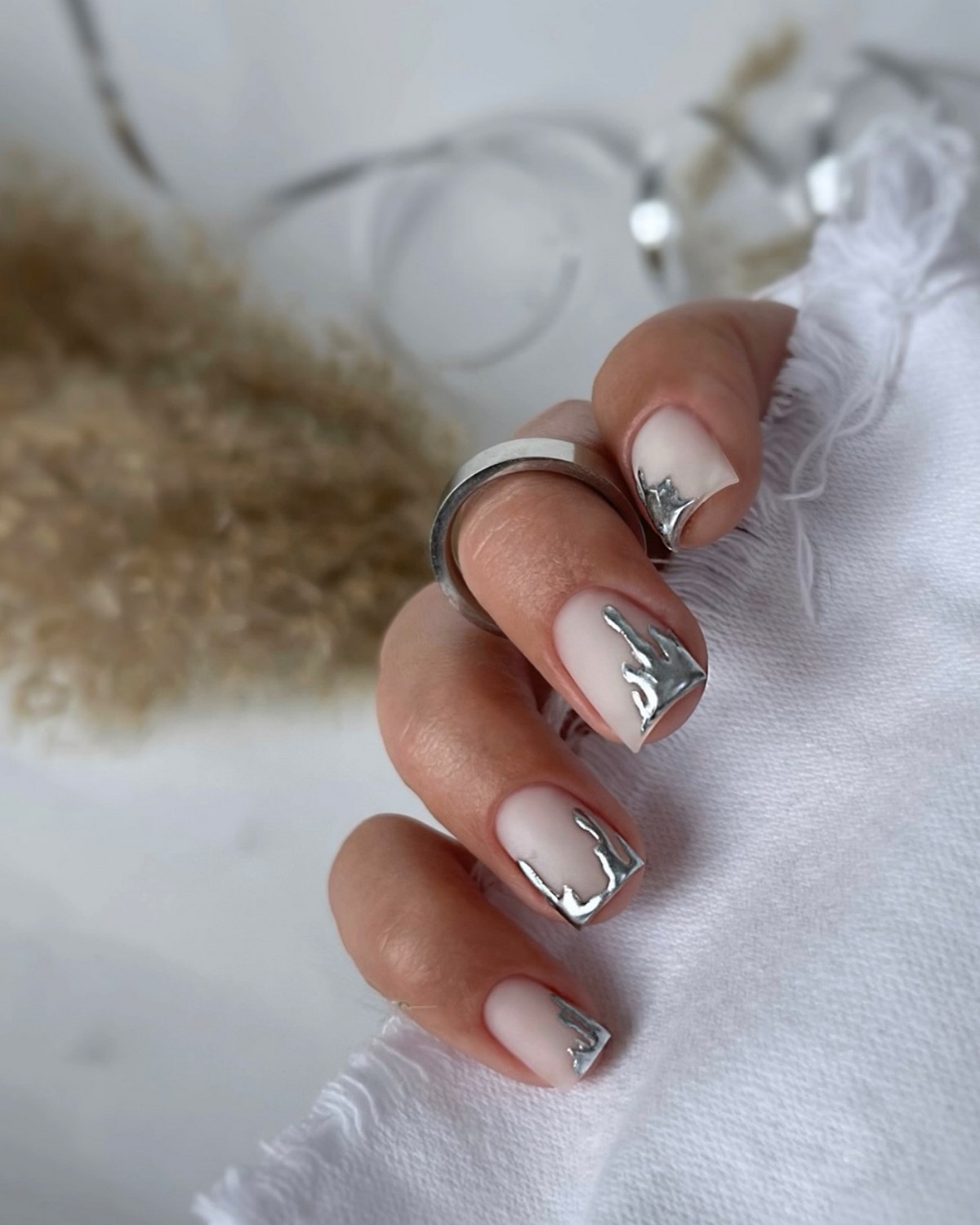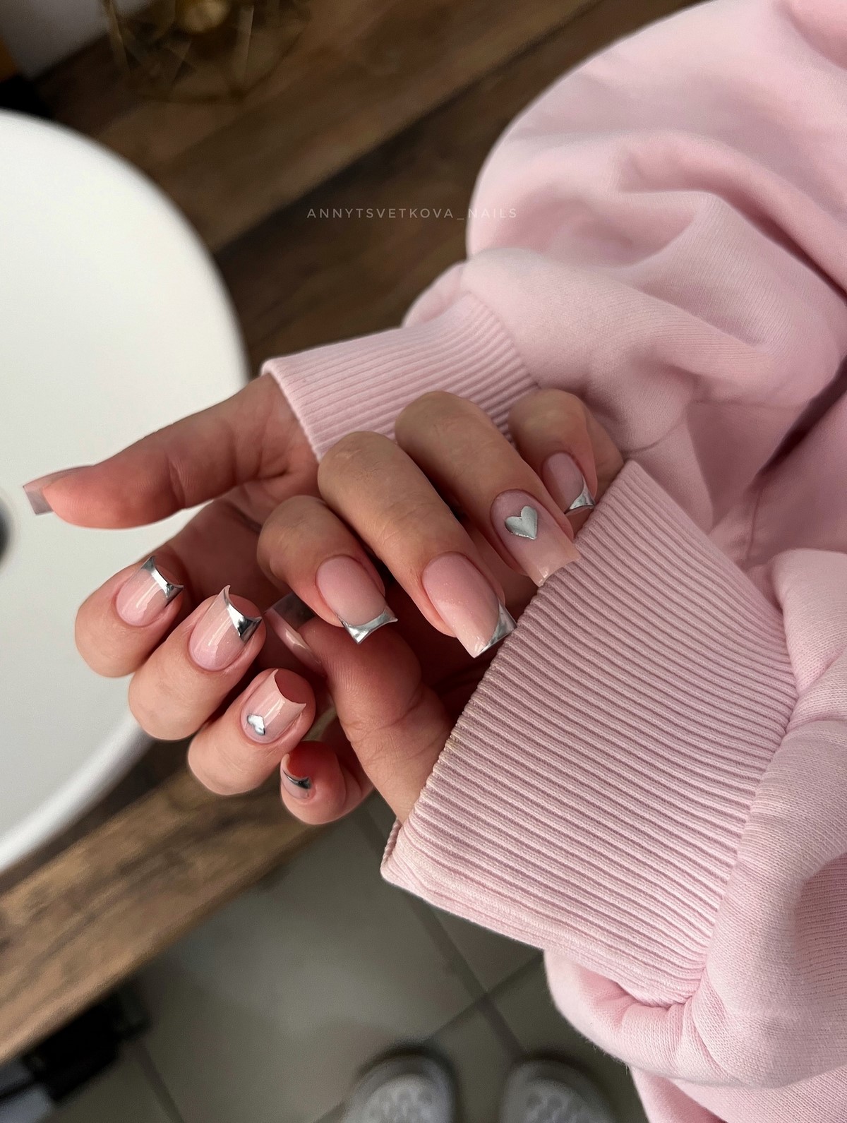 Серебристые, платиновые и золотистые кончики — тренд номер один зимы 2025-2026. Металлический френч придает образу праздничность и подходит для вечерних мероприятий. Можно выбрать глянцевый или зеркальный финиш, а также использовать хром-пудру или фольгу для более выразительного блеска.
