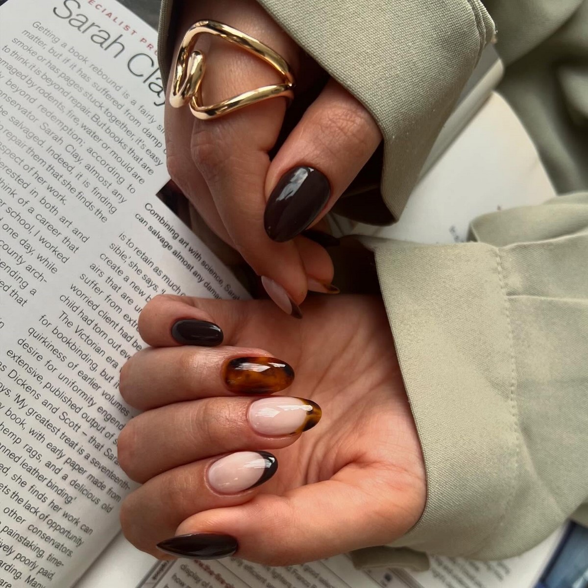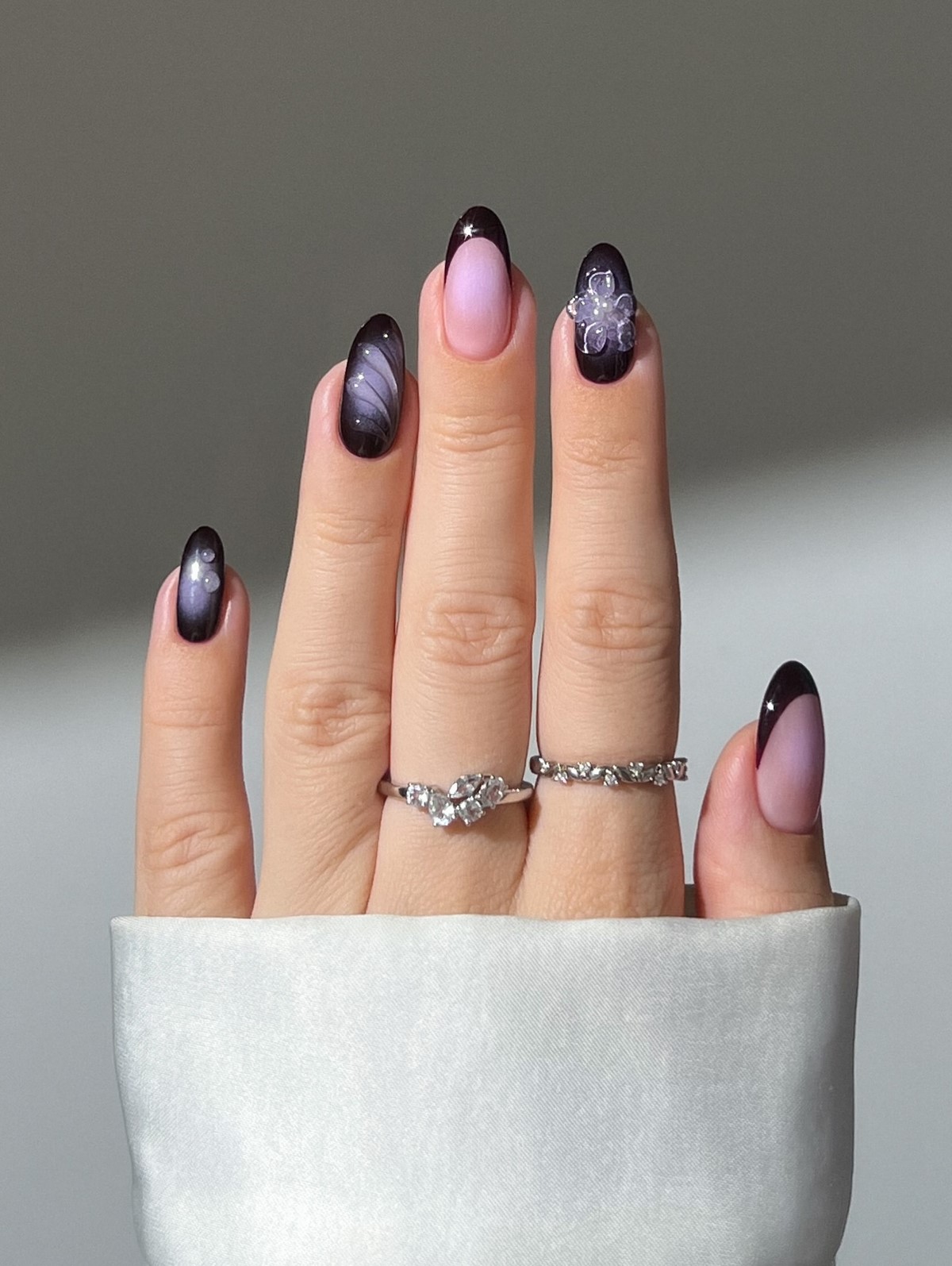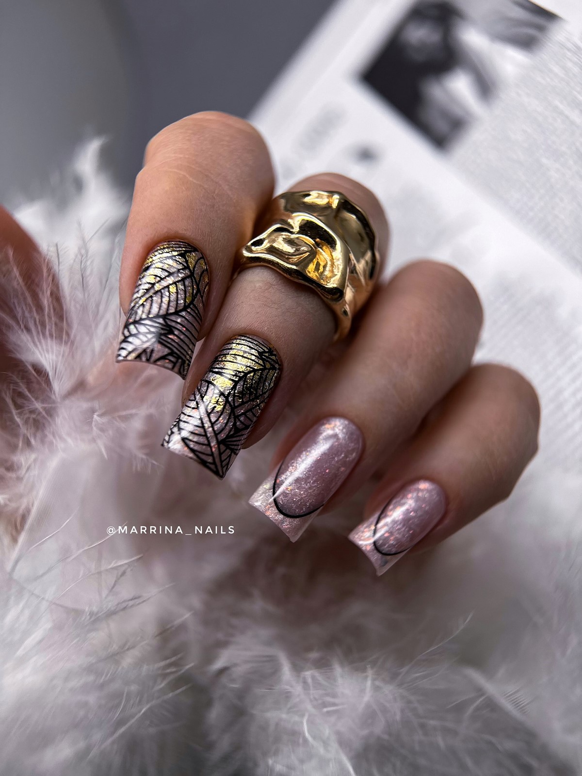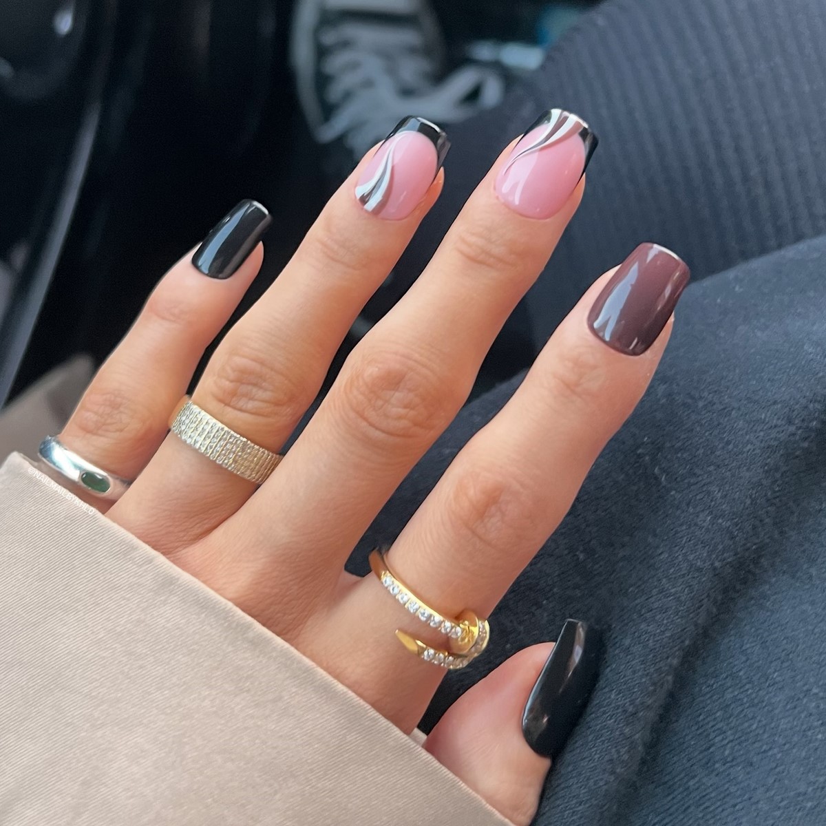 Для тех, кто любит экспериментировать. Мастера предлагают сочетать разные стили — например, на одном ногте классический френч, на другом металлик или аура. Можно играть с текстурами — матовой и глянцевой, прозрачной и зеркальной. Этот дизайн выглядит необычно, но гармонично, если объединяет общая цветовая палитра.