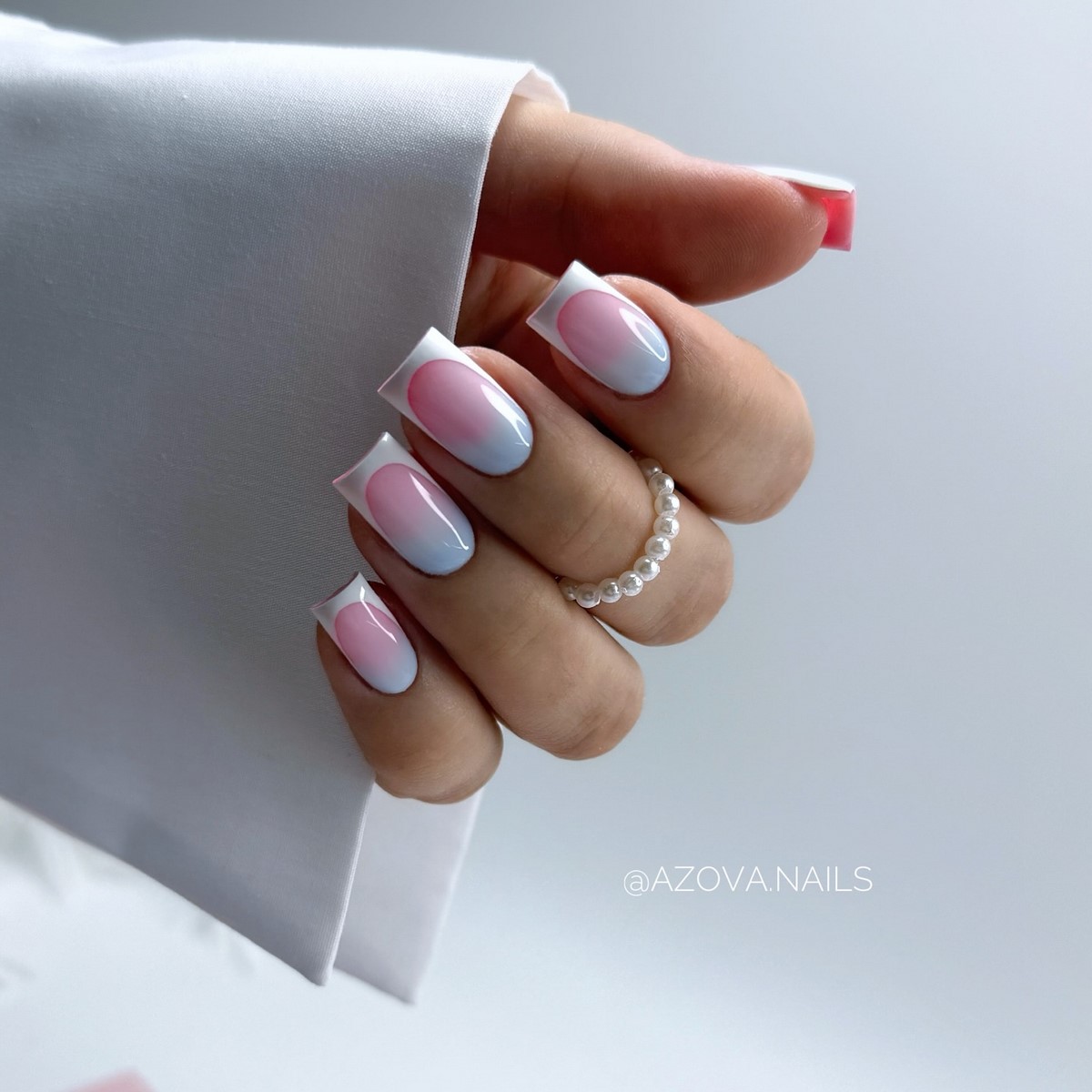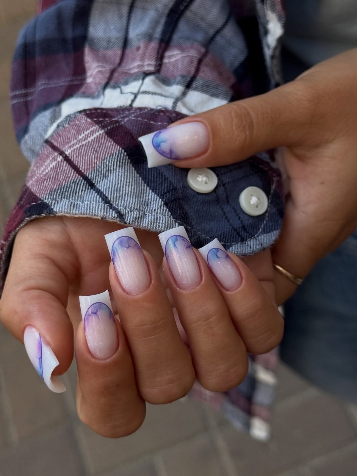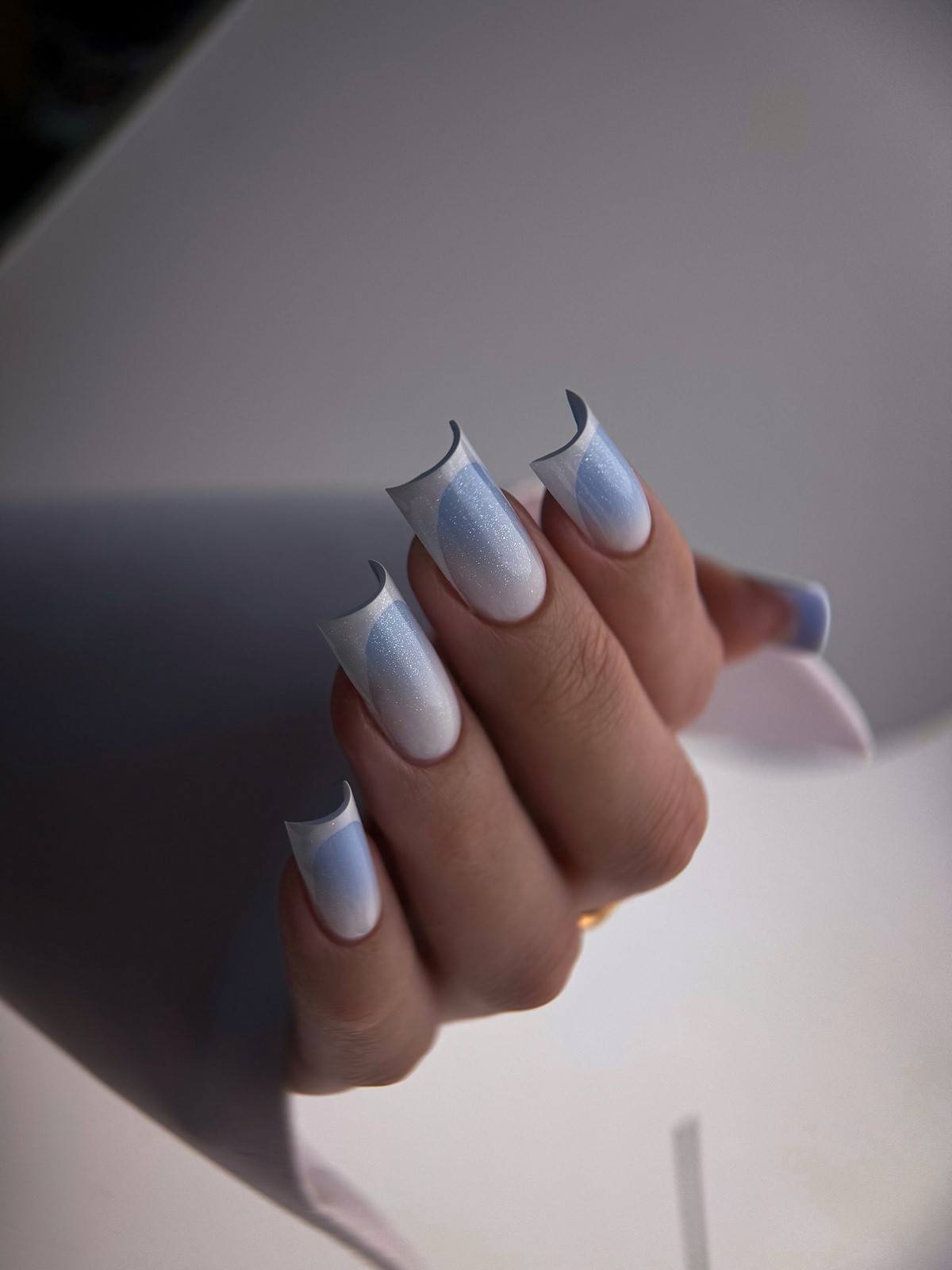 Аура-дизайн с мягкими растяжками цвета — одно из самых стильных направлений. В зимнем сезоне тренд приобретает морозные оттенки: ледяной голубой, фиолетово-серебристый, бело-розовый. Такой френч будто светится изнутри, создавая эффект сияния ауры.