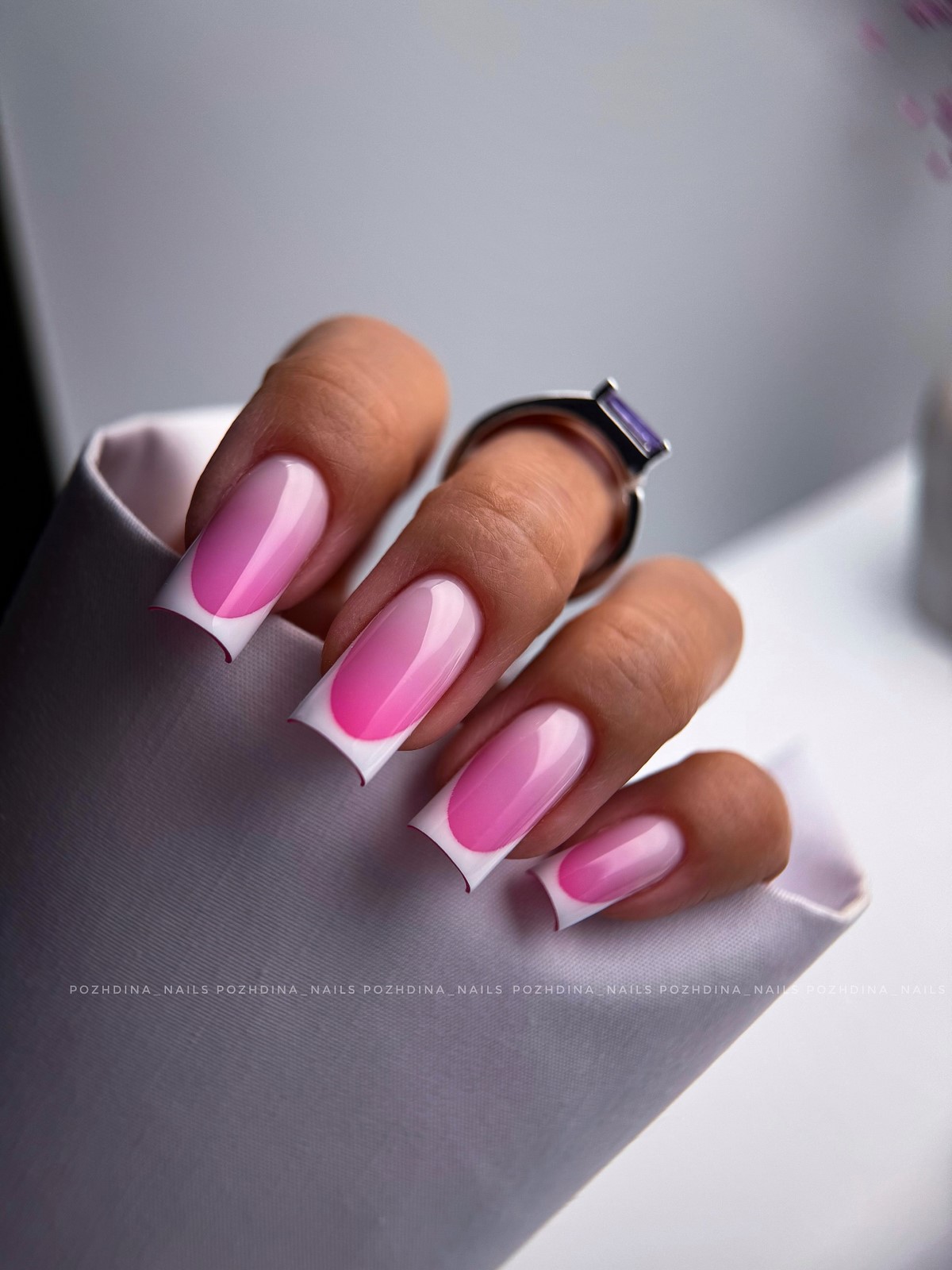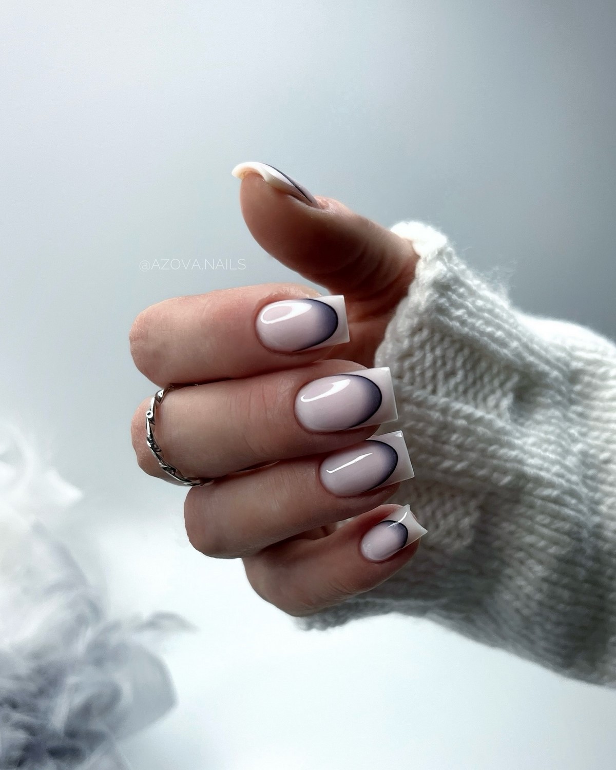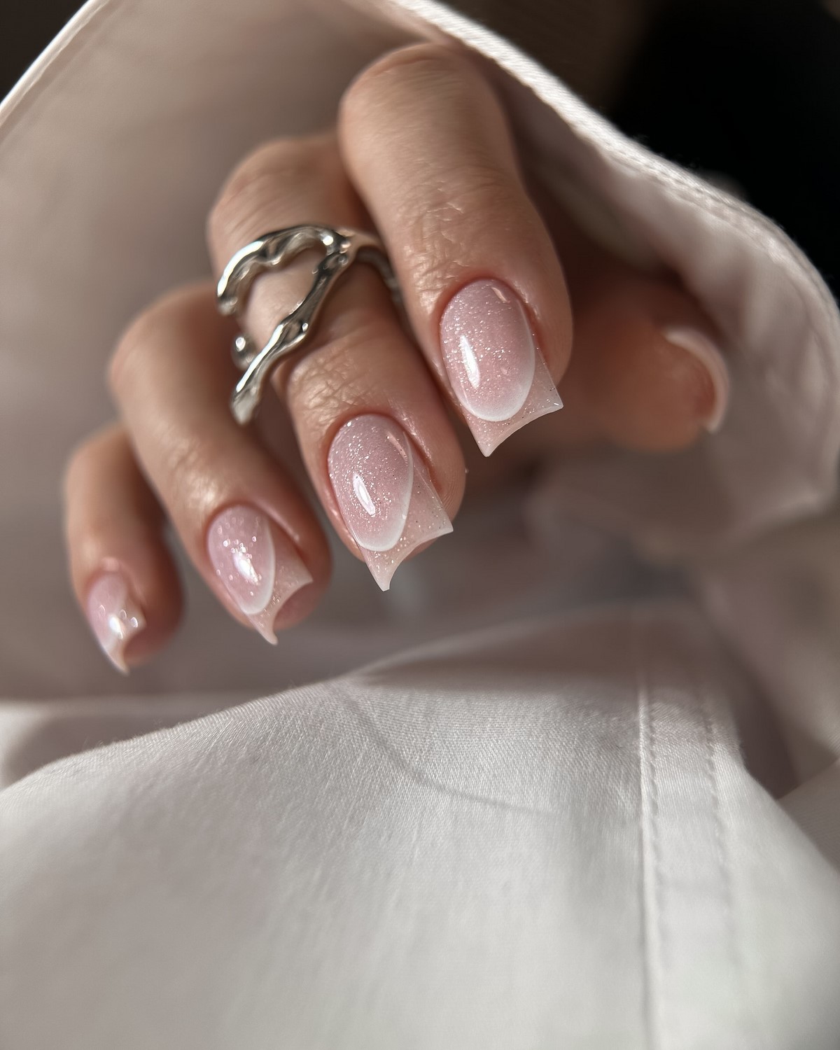 Аура-дизайн с мягкими растяжками цвета — одно из самых стильных направлений. В зимнем сезоне тренд приобретает морозные оттенки: ледяной голубой, фиолетово-серебристый, бело-розовый. Такой френч будто светится изнутри, создавая эффект сияния ауры.