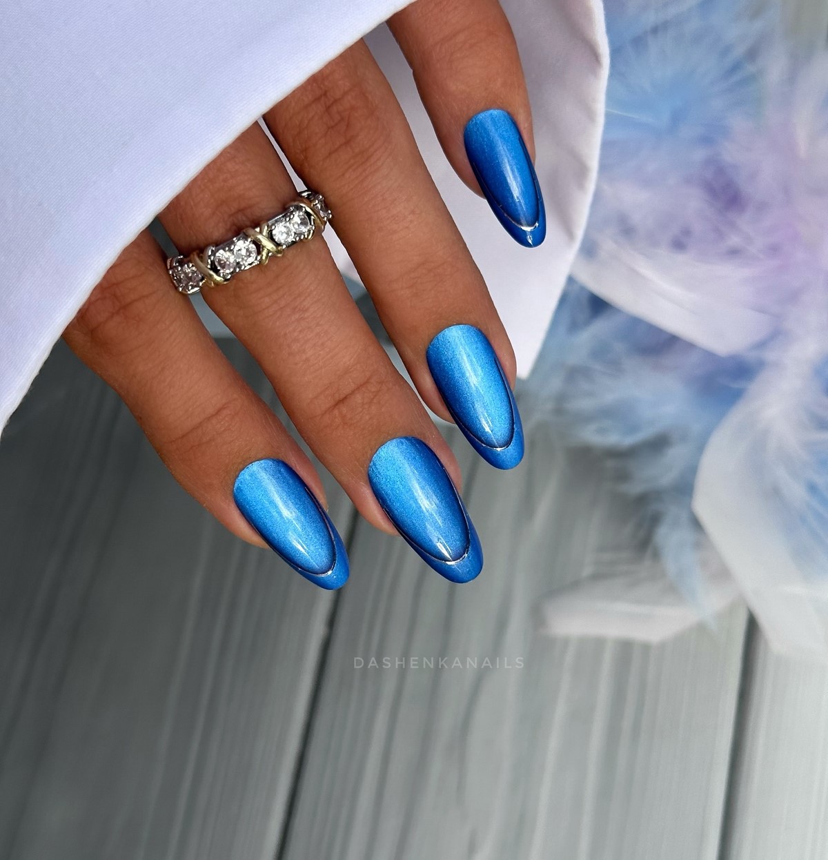 Эффект «кошачьего глаза» добавляет френчу глубину и загадочность. Тонкая магнитная полоска на кончиках ногтей переливается при свете, создавая иллюзию движения. Зимой особенно красиво смотрится френч в холодных оттенках — лавандовом, серебристом или ледяном голубом.