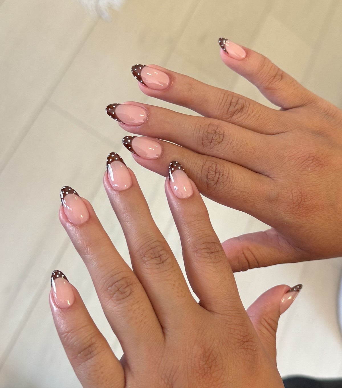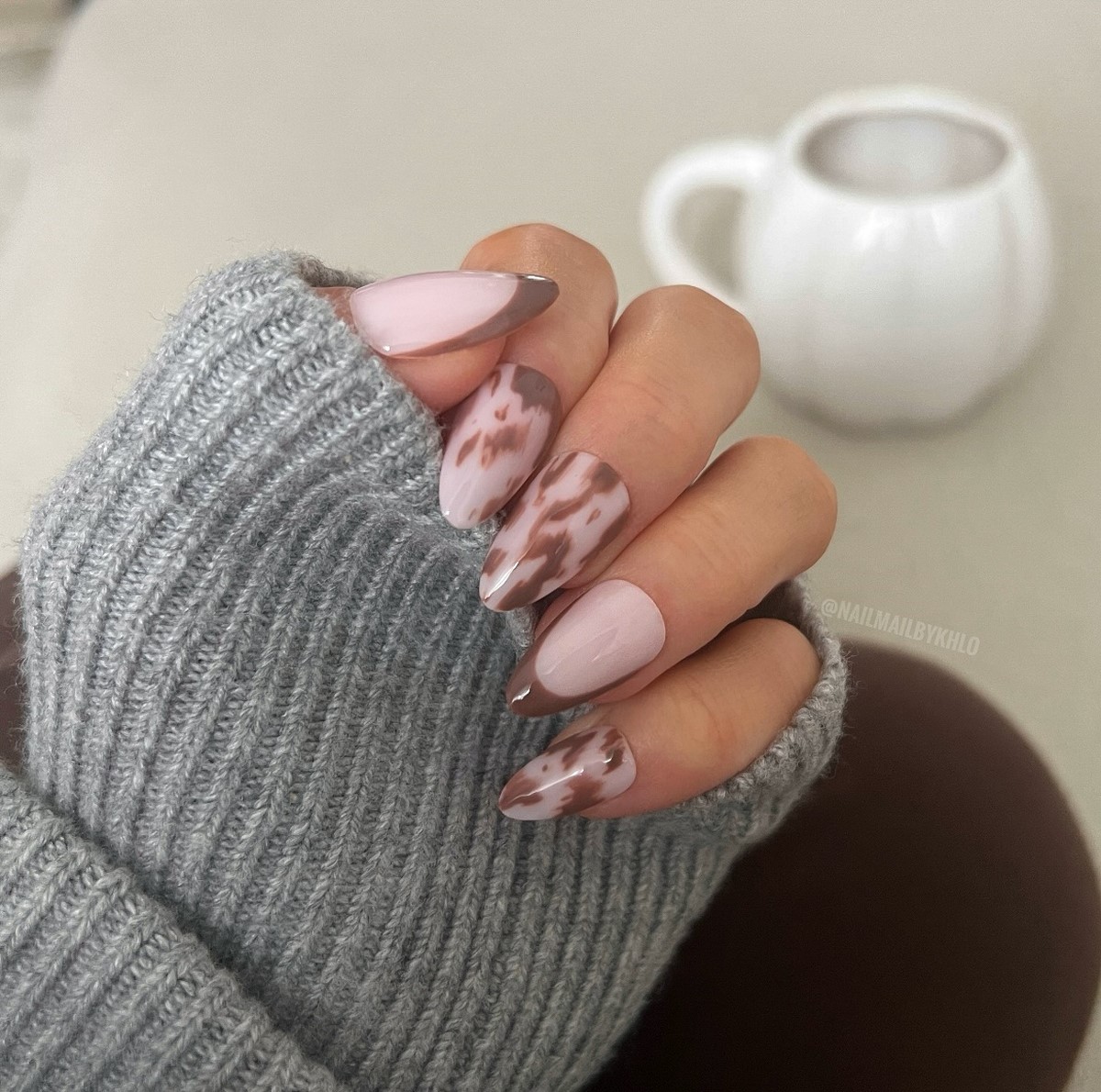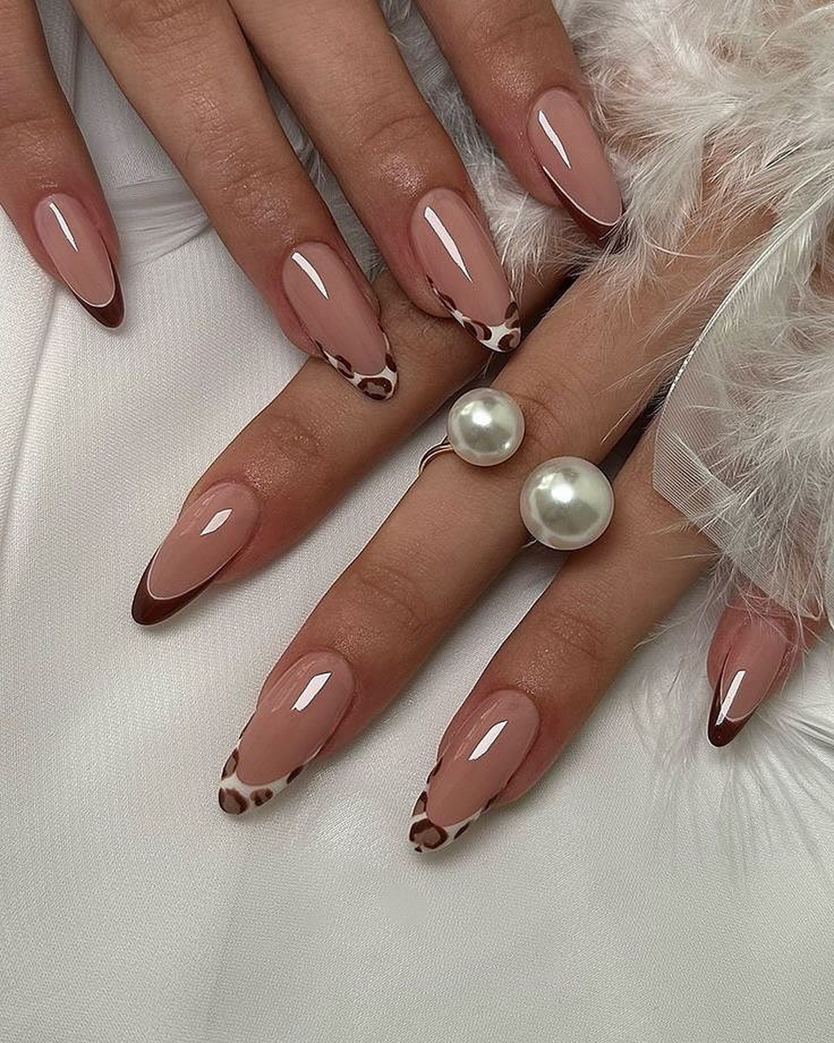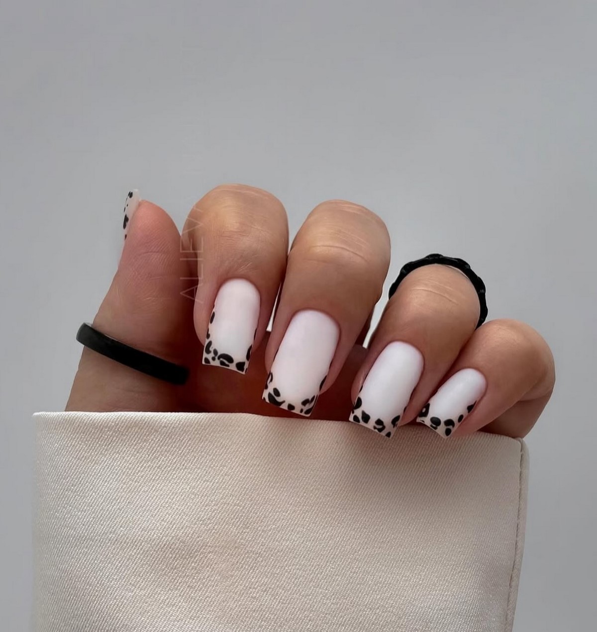 Животные принты не теряют популярности и в нейл-дизайне. В зимнем френче они становятся акцентом: зебровые полосы или леопардовые пятна располагаются по краю ногтя, сочетаясь с нюдовой или прозрачной базой. Это идеальный вариант для тех, кто хочет добавить немного дерзости в свой зимний образ.